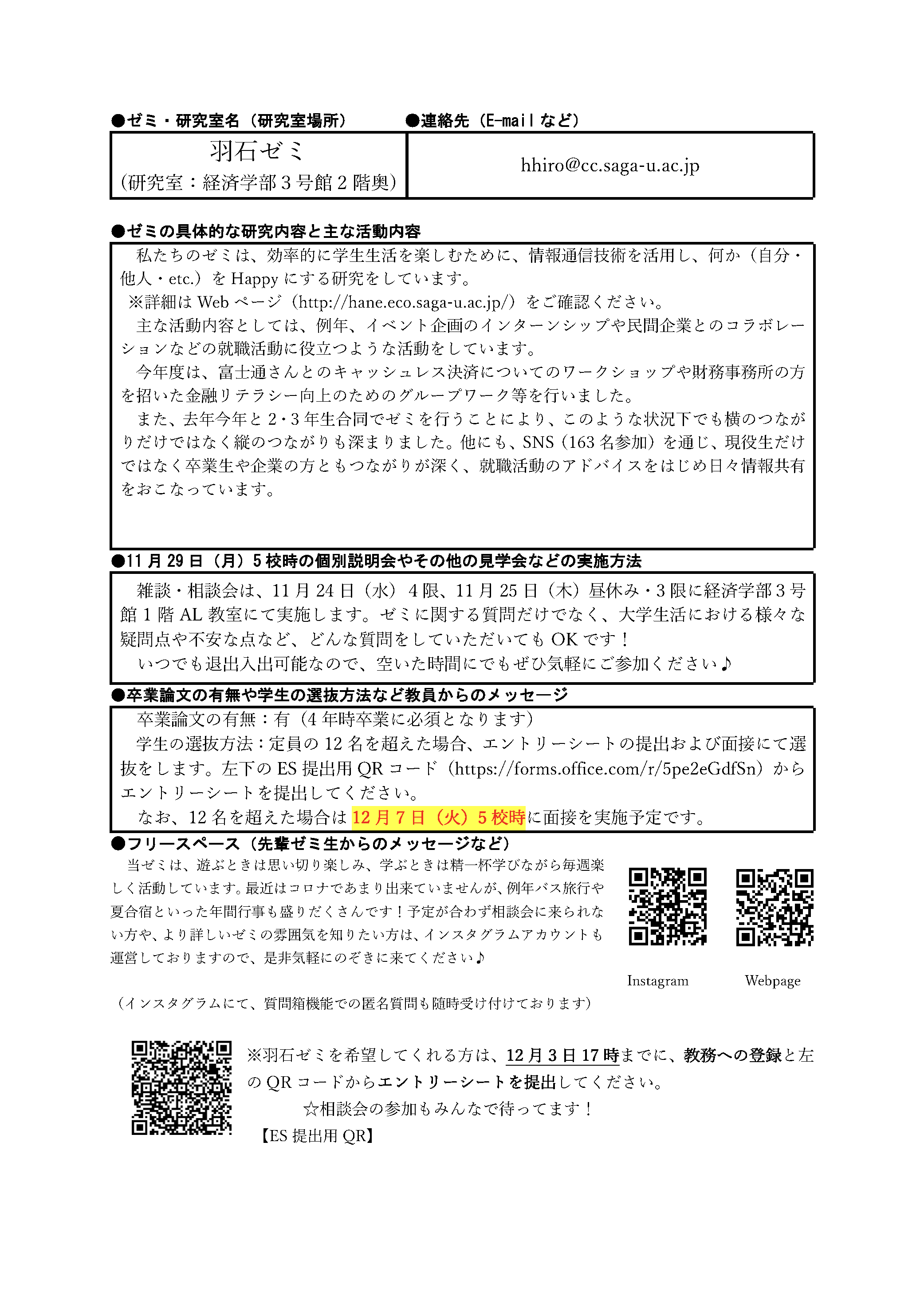 - 雑談・相談会は、11月24日(水)4限、11月25日(木)昼休み・3限に経済学部3号館1階AL教室にて実施します。ゼミに関する質問だけでなく、大学生活における様々な疑問点や不安な点など、どんな質問をしていただいてもOKです!